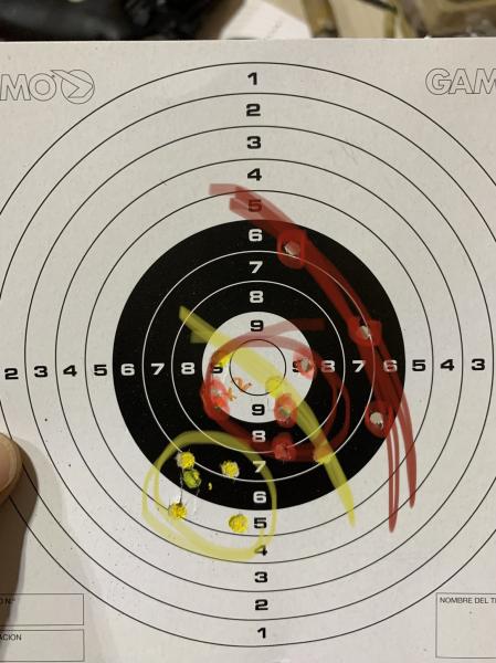 Mirad, son 8 tiros, un tambor entero con dos balines diferentes y sin ajustar miras. El amarillo son los Norica hammer que deben ser unos excite, la segunda marca de H&N. Los rojos son los jsb exact express.