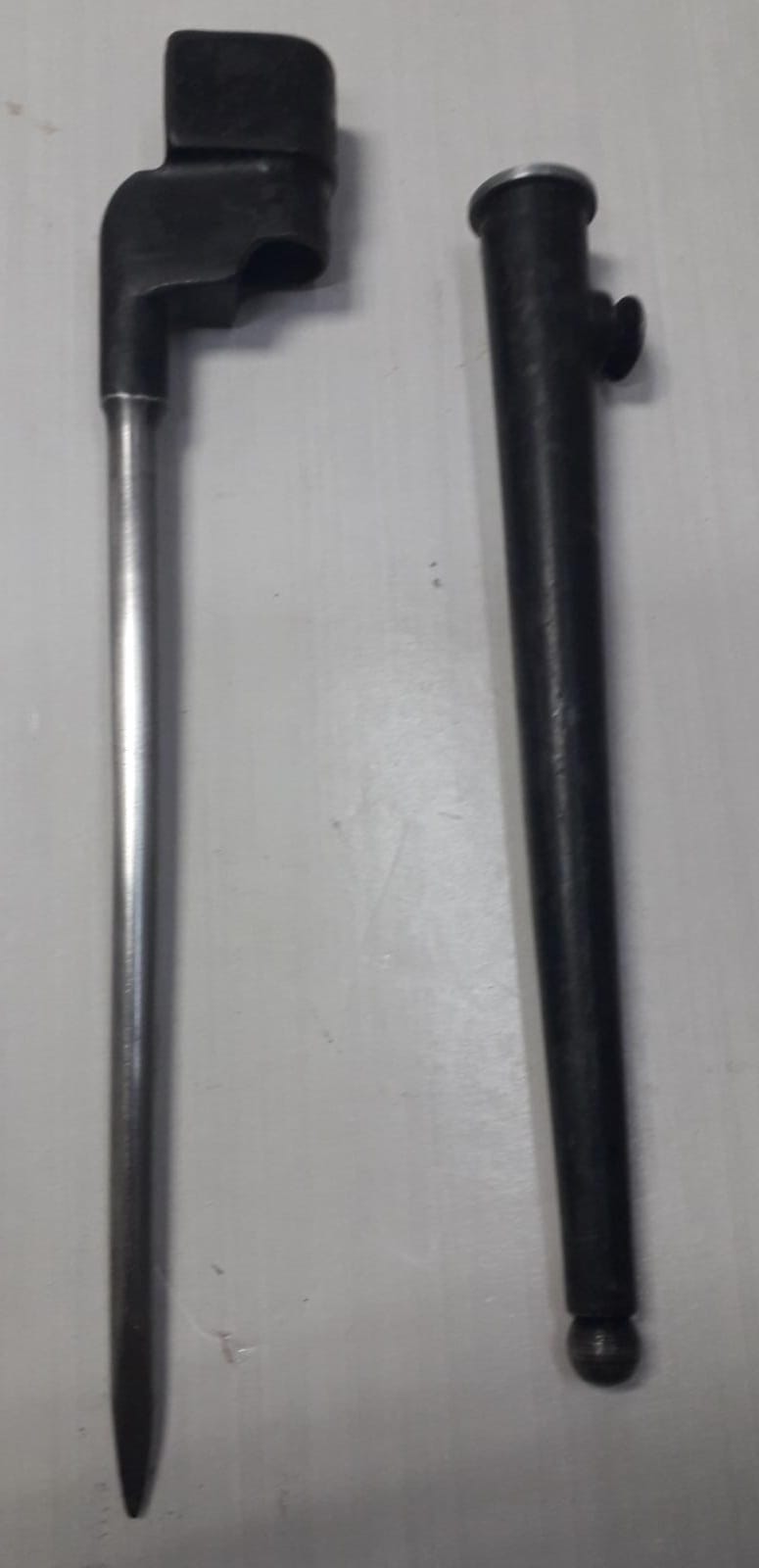 Bayoneta británica MkII "Spike" para el fusil de cerrojo Enfield Nº4 MkII. Conocida como el modelo de "pincho" se acompaña de funda metálica y se encuentra en un estado muy bueno. Precio 30 euros con envío incluido a península y 25 euros entrega en mano.