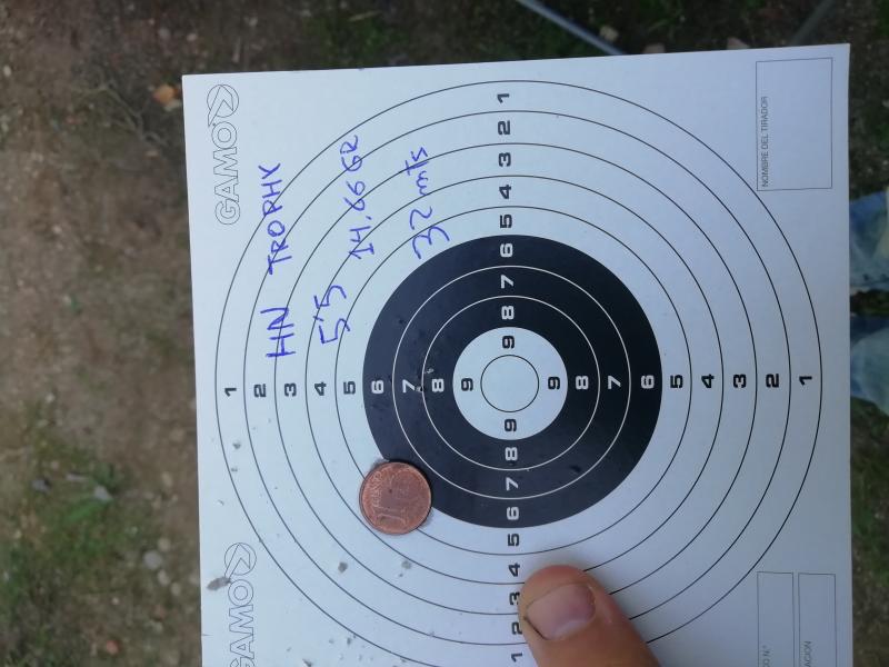 muy buenas dianas, felicidades. En la mia utilizo el JSB RS de 0,87 gramos, es el mas ligero de la gama jsb en 5,5 y me agrupa muy bien, dando unos 235 metros segundo aprox.
