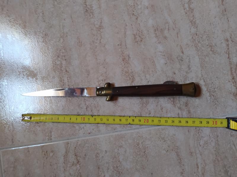 Por cierto que tengo una idéntica (ya es casualidad) y es un estilete de cuidado, hace esos 12 cm de hoja, hasta la guarda casi 14, y en la mano es bastante tremenda. Propia de un quinqui ochentero, en toda regla.