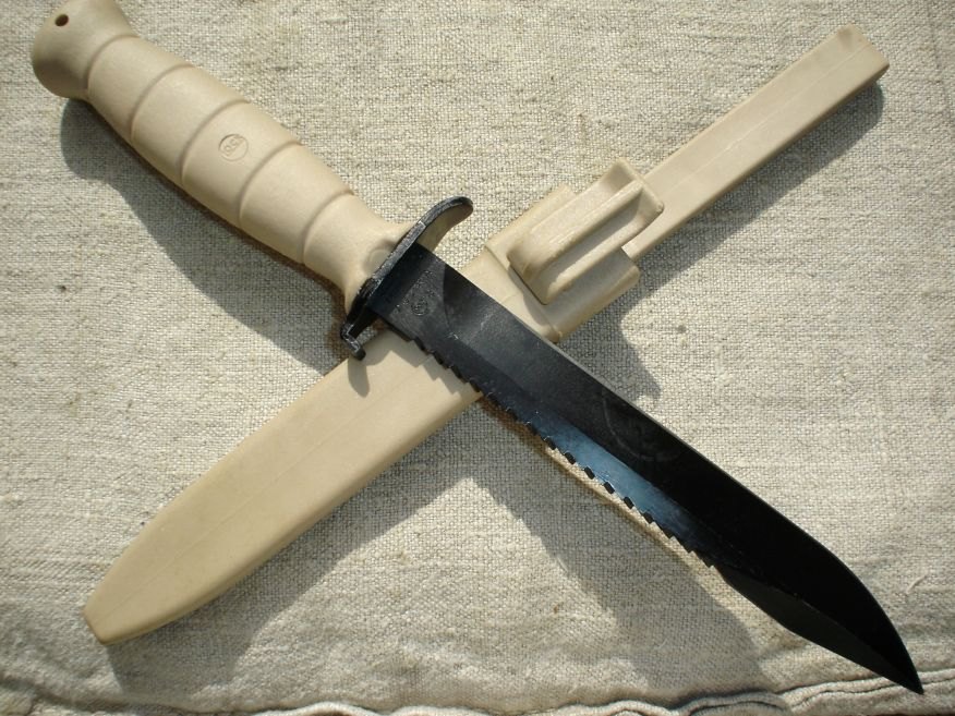 Me explico, el plástico es simplemente asombroso, y ya tiene unos años, es el gran avance que hizo glock en su momento y lo que los diferencio del resto, una barra de acero 1095 soldada prácticamente a este plástico le confiere unas cualidades para absorber las tensiones de los golpes asombrosa, eso unido a que al no ser enterizo le hacen también aislante de la electricidad junto con un acero de ballesta, fácil de afilar y duro, junto con una funda increíblemente practica y funcional.