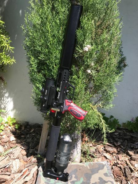 Mi unidad lleva instalada una botella de carbono de 350 cc. Esta cantidad de aire aporta una excelente autonomía de disparos al usuario sin tener que tirar de scuba, y no añade un excesivo peso que desvirtúe la ligereza y portabilidad del arma. La botella se integra extraordinariamente en la estructura de la carabina.