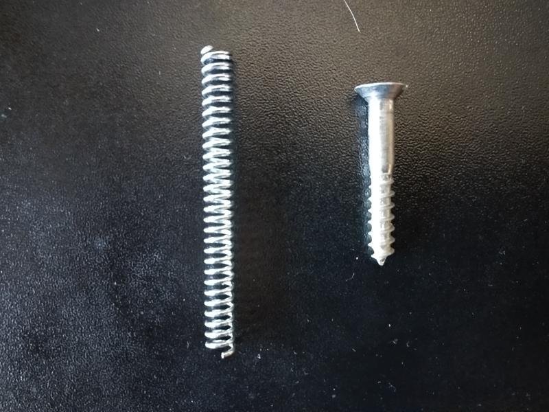 Tornillo roscado al que solo le falta rebajar la cabeza con una lima o mas facil con la Dremel, para que al tener el mismo grosor que el muelle entre sin problemas en el percutor.