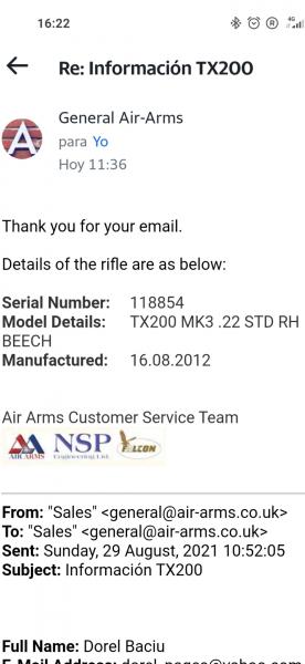 Siguiendo tu consejo envié un mail a fábrica air arms en uk y tengo aquí la respuesta.Por cierto el vendedor me decía que es del 2015-2016.Te agradezco mucho compañero por tu ayuda.