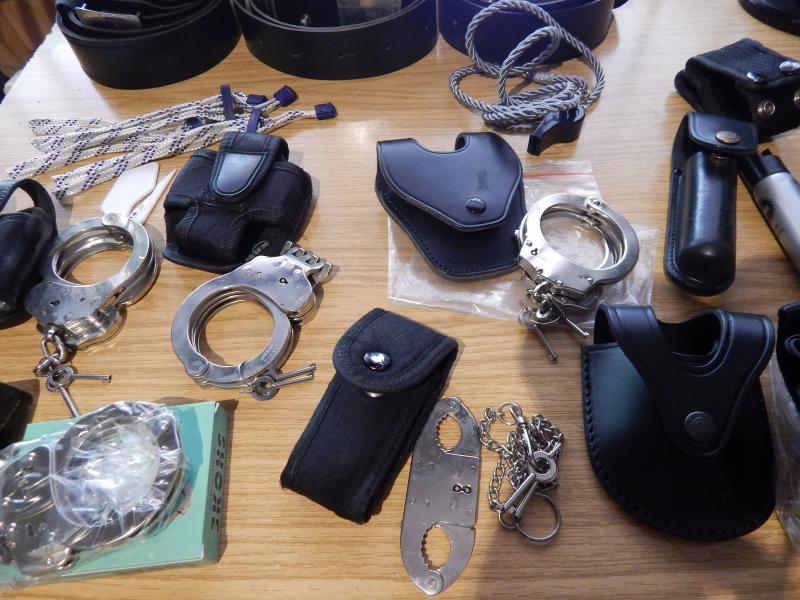 Vendo material seguridad, 5 cinturones, grilletes ( 4 de cadena,1 de bisagra, 3 de lazo, 1 de pulgares),4 defensas, cananas, fundas arma, equipación para tiro, etc. 150 euros lote.
