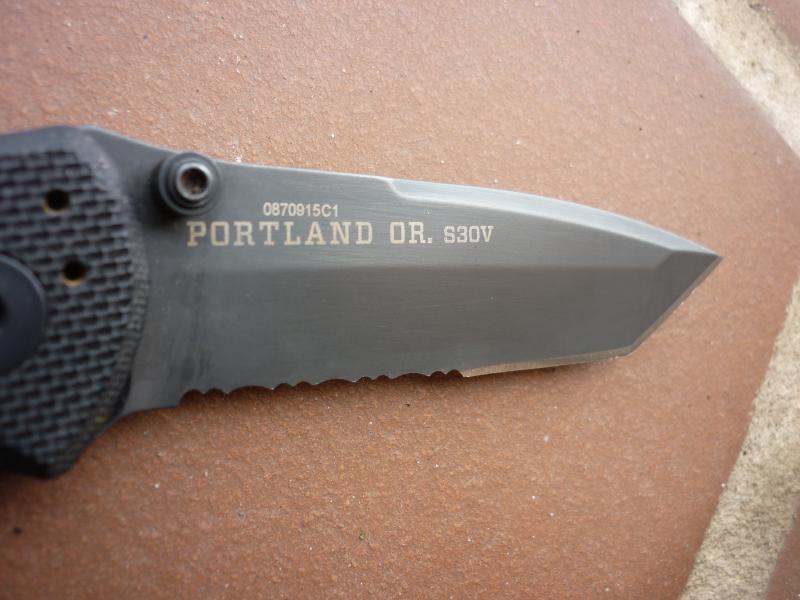 DATOS TECNICOS : Construido en Portland, OREGON, hoja de acero S30V, parcialmente serrada estilo Tanto, recubrimiento de óxido negro para resistencia a la corrosión, cachas en G-10, pomo con orificio para cordón, apertura automática, bloqueo de inmersión y pulsador de seguridad, clip de bolsillo de tres posiciones.