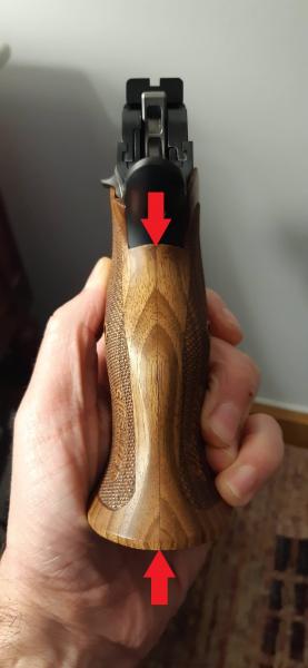 No es mayor en el sentido de más gruesa, de hecho puede que incluso sea algo más fina, pero elimina el reborde de abajo contra el que pega el menique en manos grandes. Digamos que es lisa de arriba a abajo en la parte delantera, con lo que se empuña mucho mejor.