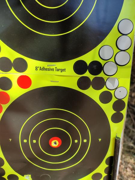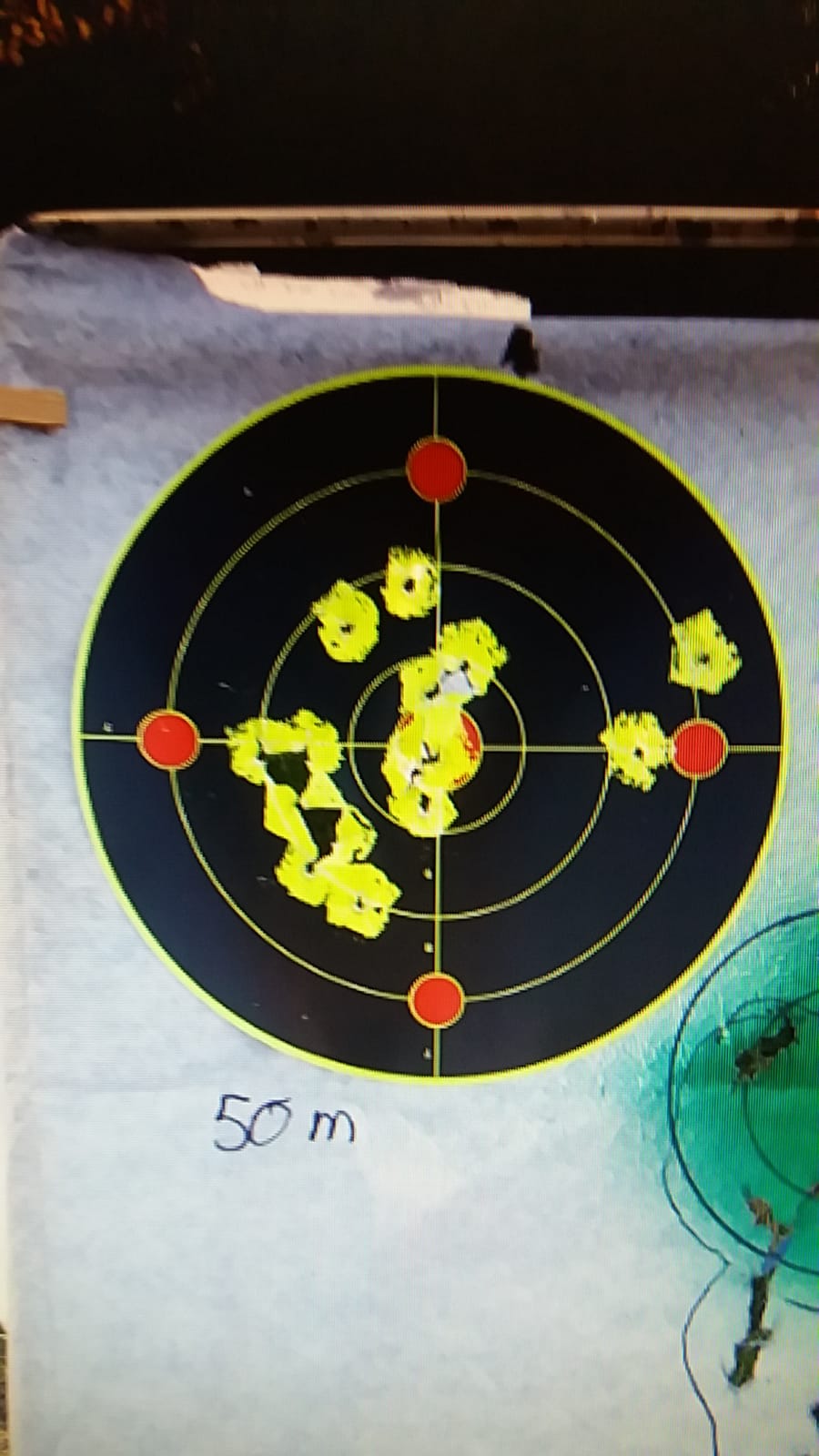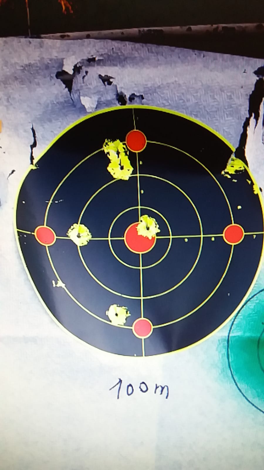 Dejo mis agrupaciones a 50, 75 y 100 metros. En la diana de 50 la agrupacion de la izquierda/abajo fue antes de ajustar un poco el visor pero los tiros iban razonablemente juntos. Las dianas son de 20cm de diametro.
