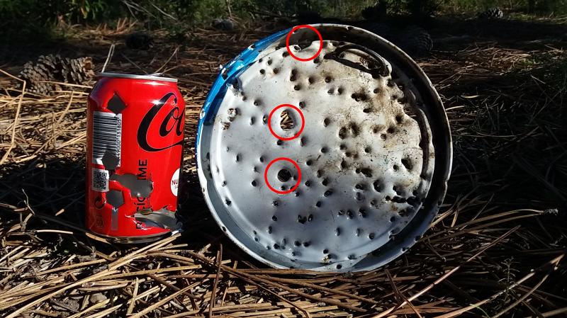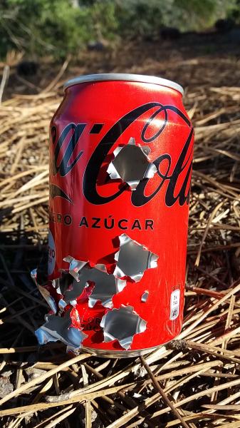 Hoy he ido a centrar el visor ya que pase la revista de armas el mes pasado. Despues de unos tiros de prueba me diverti bastante haciendo dianas. Luego puse una lata a 35, 50 y 60 metros y aunque falle algunos (apoyado en trípode) en la fotos podeis ver 7 impactos, dos de ellos a 60 metros. La tapa de la lata de pintura la puse a 100 metros y le di 3 impactos de 5 tiros, de nuevo fallo del indio, el resto son perdigones de cartuchos de caza.
