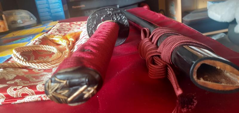 Tsukaito de algodón rojo y tsuba que es reproducción de una tsuba del período Edo.