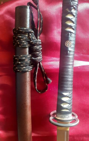 La katana es funcional y está muy afilada. Con la espada se regala un kake ( expositor ) doble de pared de madera lacada, un sageo a juego y una funda de seda a juego. Su precio : 230 E con envío incluido ( dentro de la península ).