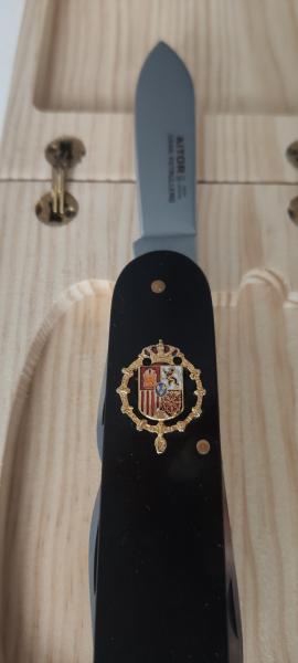 Aitor Gran Patrullero en micarta con escudo de la Casa Real y con caja de madera. La navaja esta hecha por Aitor.