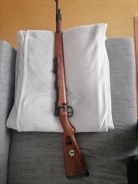 Bonita pieza ; no soy un experto en el magnífico K98 pero parece una unidad compuesta en el arsenal en época en el que el 3Reich ya estaba con carestía ; te comento esto porque ni cantonera , ni abrazadera porta bayoneta y supongo que culata de madera laminada no corresponde con el año de fabricación ( 42 )