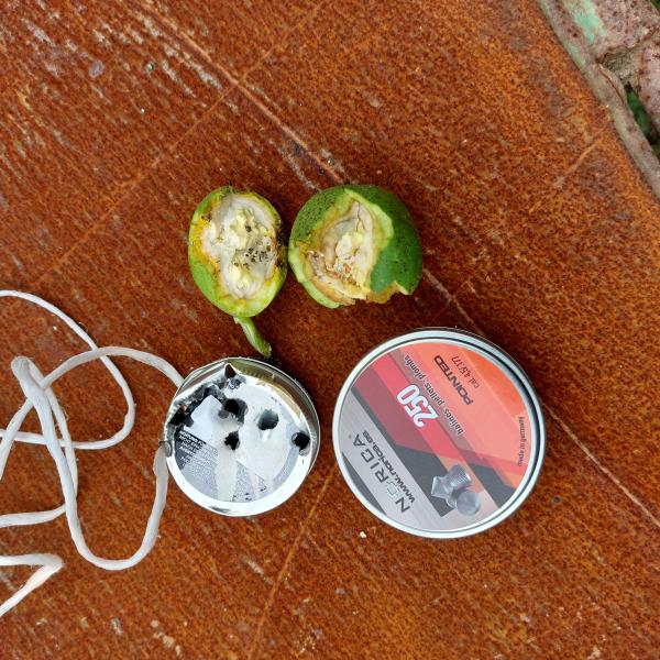 Las primeras del arma, y de una lata vieja de balines y unas castañas a las que he disparado a 10 metros. Es espectacular como se le puede dar a algo tan pequeño y reventarlo, una gozada.