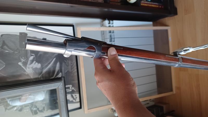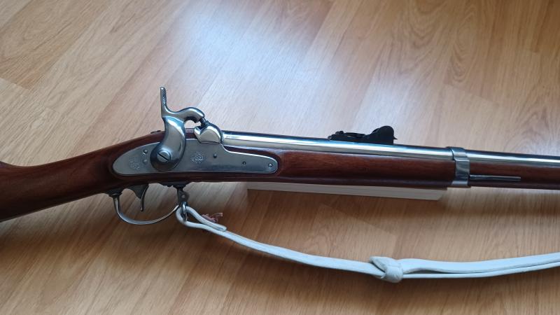 Buenas a todos. Se trata del 1847 con cañon estriado, derivado del 1842 de ánima lisa. Calibre 69. Puede disparar tanto bala minié o bola, pero no sé lo bien que dispara porque jamás lo estrené. Es el ultimo arma de avancarga que compré antes de pasarme a la pólvora sin humo, y ha estado colgado de adorno en la pared.