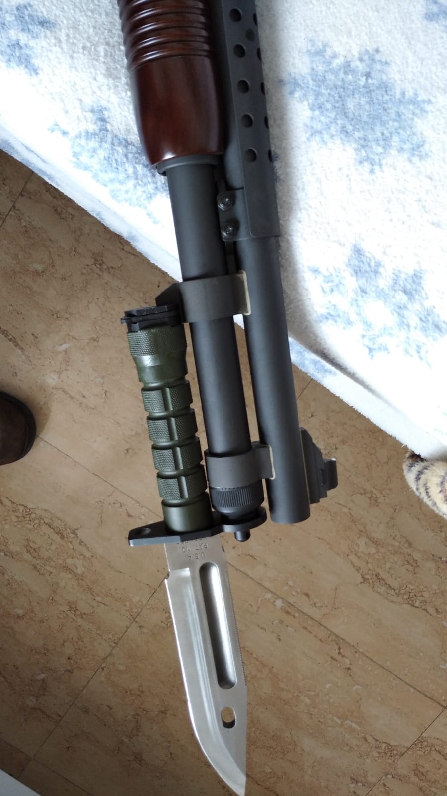 Compré dos bayonetas para una 590a1, un dato a tener en cuenta esque los retenes del mango que encastran en el soporte de bayoneta no están bien montados en las que se han vendido, yo tuve la suerte de que al comprar dos intercambié las piezas y se me han quedado como debe ser porque si no no entran en el arma. Precio 190€. Está nueva a estrenar.