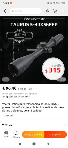 Elagu escribió:Gracias , al final he encontrado hoy un Vector Optics Taurus de 5-30x56 FFP en aliexpress por 79€, y me lo he comprado sin dudar, igual es mucho para mi, pero bueno, era un preciaco!