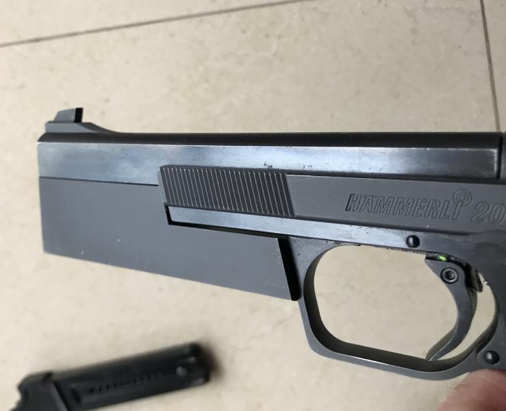 Más fotos, la Hammerli es toda de acero suizo, de las que hoy no se fabrican. Las actuales Hammerli mezclan el polímero y no tienen la calidad ni la maestría de las antiguas hechas a mano. Aparece con el contrapeso de 270 grms, tiene otro de 90 grms.