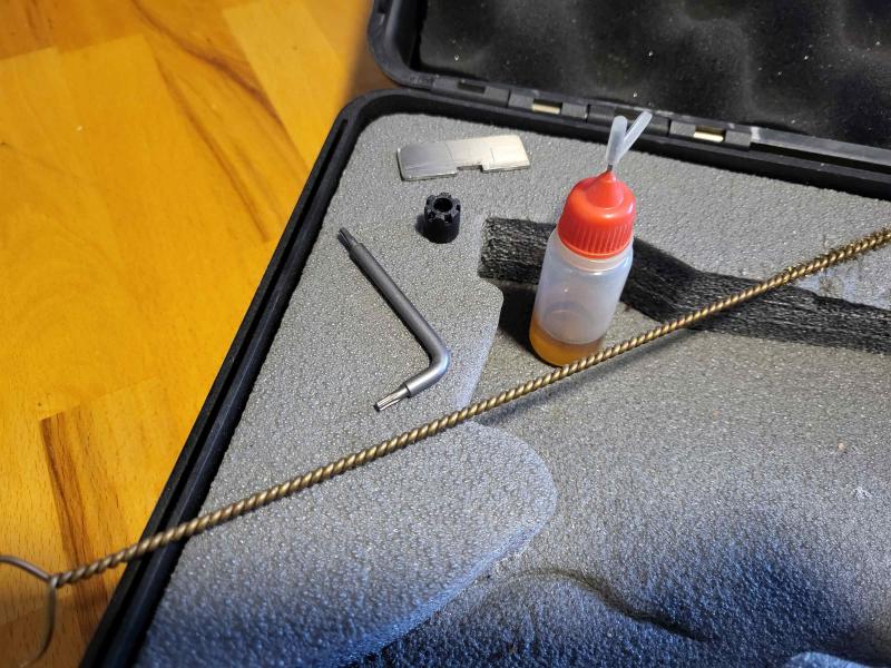 La entrego con el maletín original, y todos los complementos que traía (baqueta de limpieza, llave para ajustes y botellín de lubricante).