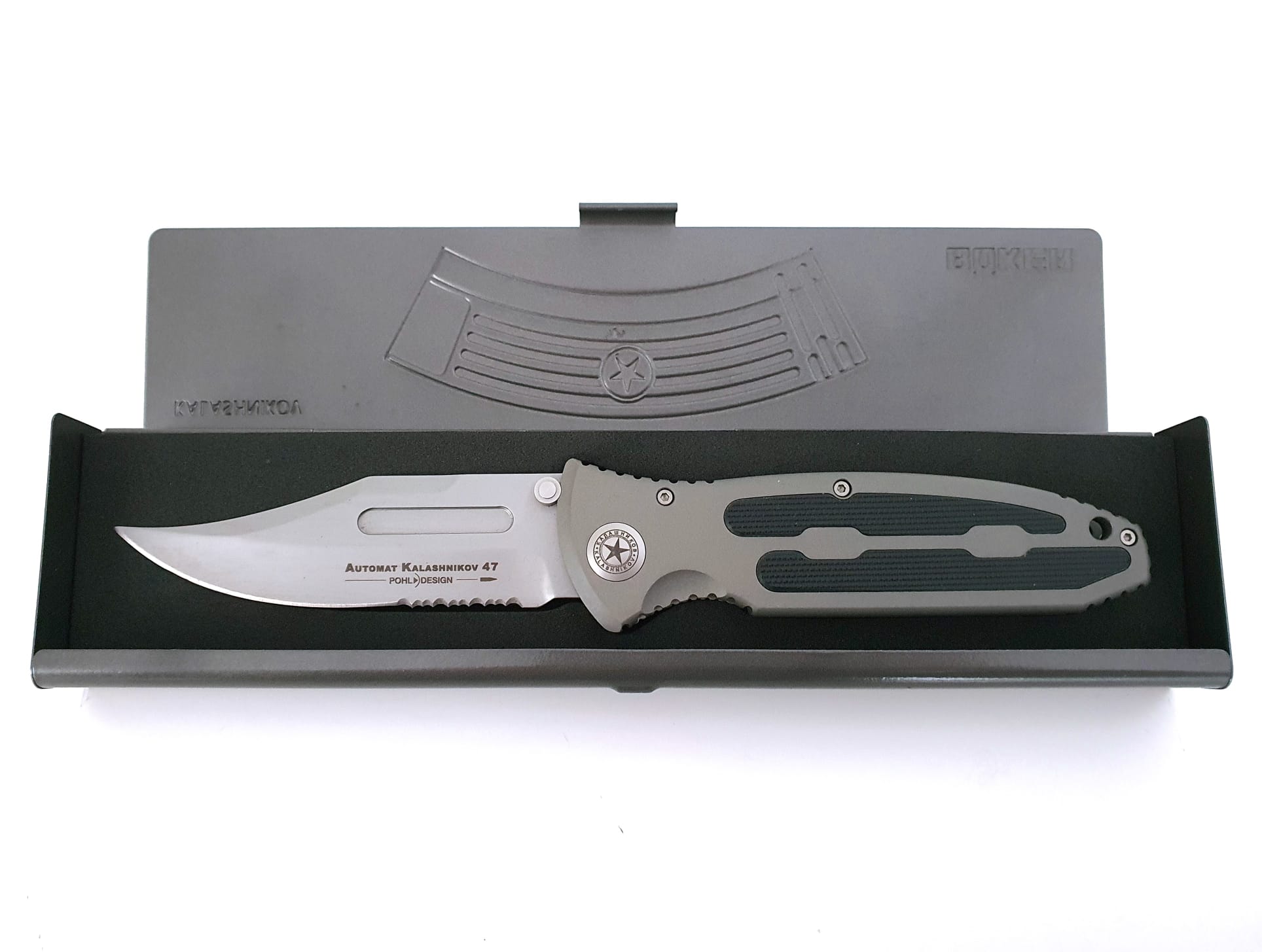 BÖKER KALASHNIKOV STANDARD 47 KNIFE: Navaja inspirada en el fusil de asalto AK-47. El mango está hecho de aluminio anodizado de capa dura con incrustaciones en la parte frontal y clip en la parte trasera. Hoja martillada y parcialmente dentada. Producto descatalogado. 190€