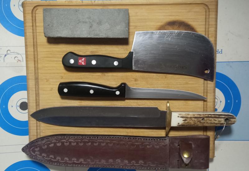 Yo uso principalmente los Mora/Bahco, son pequeños (no hace falta mucha hoja, de hecho estorba), muy afilados, de mango de goma que para la tarea va de lujo, y baratos. Quizá les sobre la punta tan aguda, para pinchar la piel a la hora de pasar los ganchos por las patas va bien, pero para lo demás a veces sobra. Eso combinado con un hacha pequeña de caza o tipo de cocina que sea contundente, y tienes lo necesario.