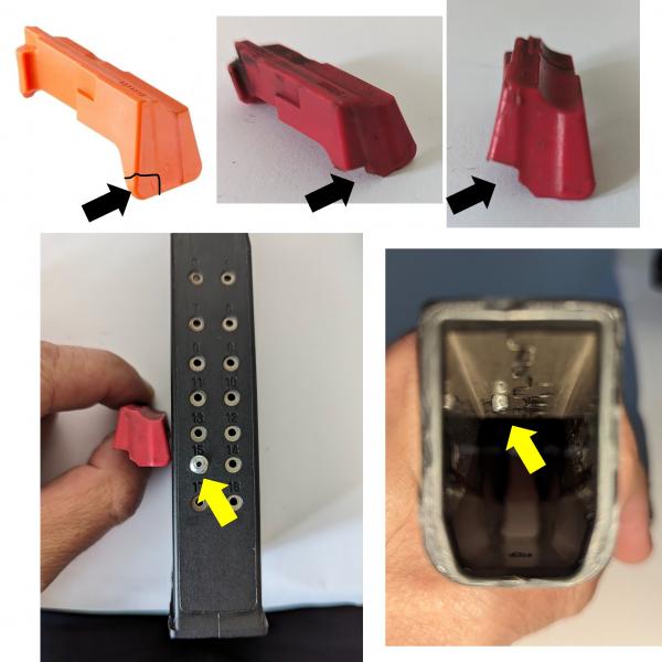 Problema 1: La pieza que pongo en la foto con una flecha roja es la que hace de tope al cargador. Esa pieza es muy fina y hace que de ir chocando con el tope de plástico del cargador (flechitas rojas) se lo vaya comiendo, sobre todo si lo metes con mucha fuerza. Por lo que cada vez entra más, y a veces el cerrojo al accionarse choca con la parte trasera del cargador quedándose sin cerrar.