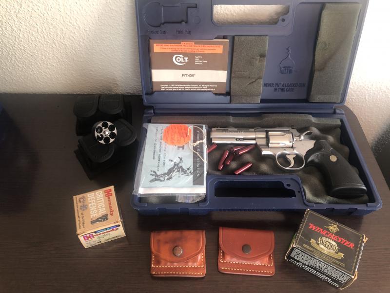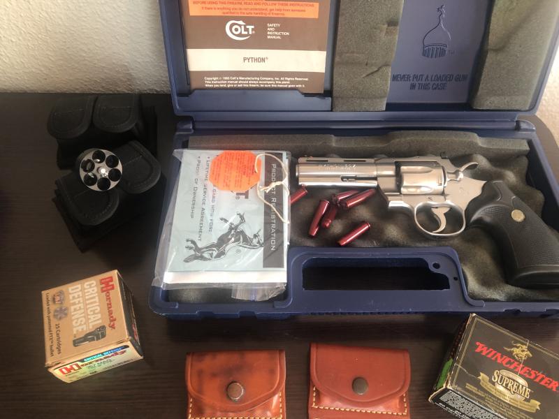 Vendo un Colt Python en calibre 357 Magnum, de 4" y es Stainless Steel. Ha estado documentado en licencia B y ahora en F, nunca se usó como arma de tiro deportivo.