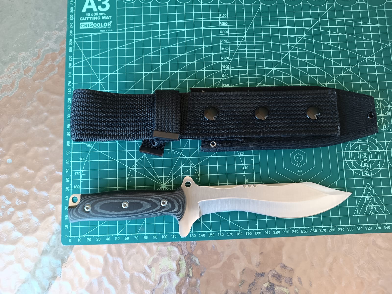 Cachas desmontables de micarta negra con hueco para colocar cordón fiador. . Funda de cordura negra con cierre de broche. Facilmente adaptable en altura.