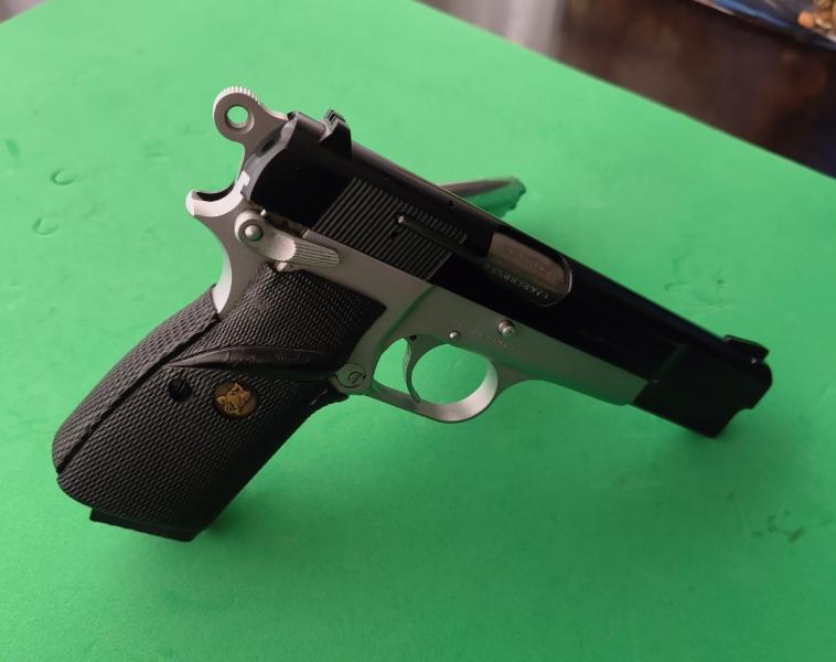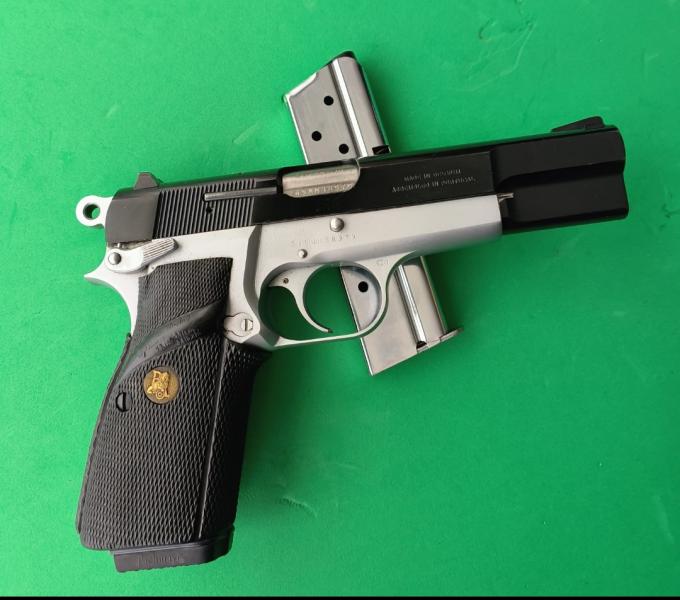 Magnífica pistola marca Browning HP 35 (High power) del 9 mmPb., con cañón de 12 cm, de excelente empuñadura y de las mejores ergonomía del mercado y de gran precisión, quizás una de las pistolas más bonitas del mercado, está prácticamente nueva como se puede apreciar en las fotos y tan solo habrá tirado unos 250cartuchos, se vende con: