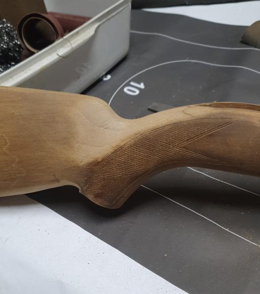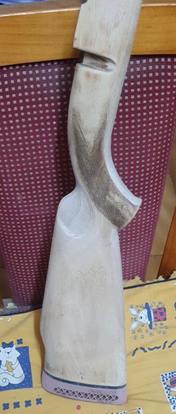 Por el tono claro que la madera, parece HAYA, muy usada en armas, y la pega que tiene, es que tiñe muy mal a mano, por la diferente densidad de las vetas, y para que quede un tono uniforme, ha de teñirse a pistola, como sí pintaras.....