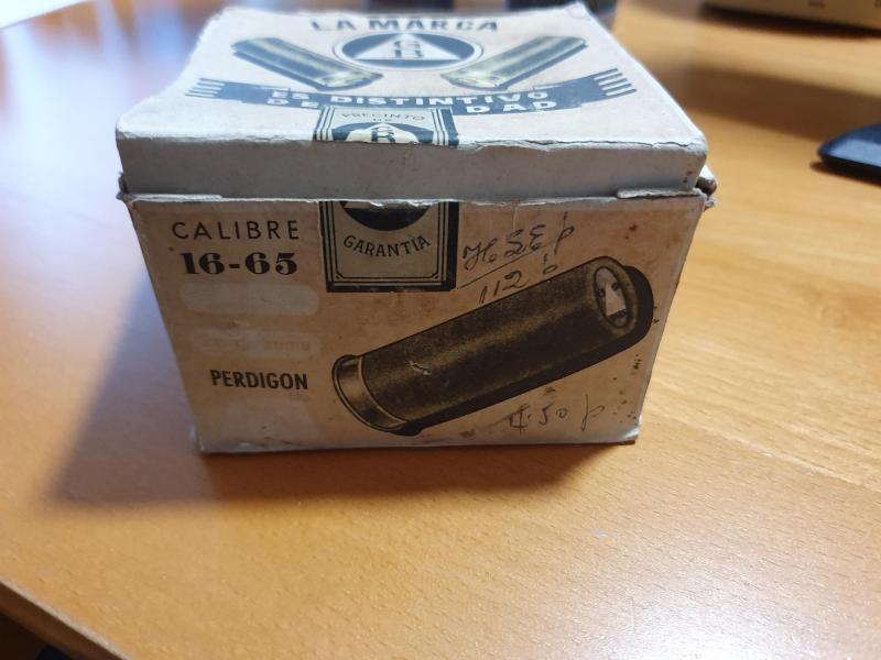 Un amigo ha encontrado en casa de su anciano padre una caja de cartuchos de escopeta del 16/65, casi completa. Nos gustaría tener una idea de la fecha de fabricación aproximada. Se trata de cartuchos de cartón, y se conserva incluso la caja original. Si el número que aparece en el extremo es el tamaño del perdigón (del 4), éstos deben ser bastante gruesos. Algunas fotos: