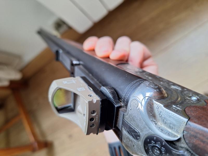 Rifle express MERKEL calibre 8x57jrs, lleva bases shuller y pletinas gravadas con ciervo y jabalí. Maderas al aceite, ni un solo rasguño. Lleva montado un punto rojo DOCTER sobre unas monturas shuller ajustadas a mano por maestro armero y desmontables.