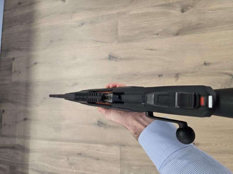 Cerrojo rectilíneo ambidiestro, se saca la palanca del cerrojo y se cambia de lado sin herramientas. Es 100% zurdo y 100% diestro en función de dónde pongas el tirador del cerrojo.