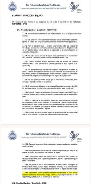 Porque el mismo reglamento también pone que no se admiten las carabinas Standard. ¿Y que es una carabina standard? Podemos decir que una carabina standard podría ser una de serie, sin modificar. Es decir... todas las demás. Es una norma que si se aplica la lógica, se admiten todas las que entren en peso, lleven cargador, y no estén modificadas. Y si nos ponemos a sacar punta al reglamento, habría mucho de lo que discutir.