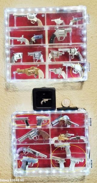 Hola a todos, aquí os muestro mi mini colección de armas cortas, pistolas y revólveres, el modelo que está entre las dos vitrinas, es posiblemente el más pequeño del mundo, funcional como todos, este dispara una bolita de 0,7mm, los demás disparan 2 mm.Son alucinantes modelos, copia de los originales, con mecanismos increíbles.