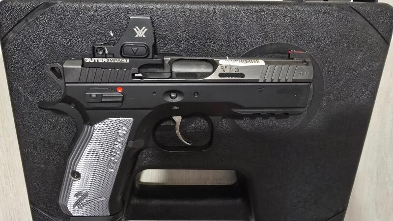 Por no usar, vendo esta pistola CZ Shadow 2 Compact, con poquísimos disparos, lleva aún la pegatina blanca en el lomo, con sus dos cargadores , estuche , manuales... Es un arma muy precisa, hace unos grupos muy apretados.