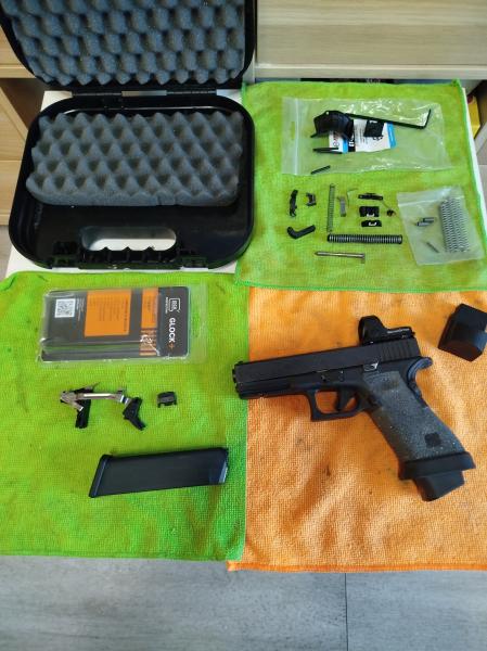 Año de fabricación: febrero 2021. Repuestos de prácticamente todas las piezas. Trabajo del agarre con carburo de silicio para un agarre magnífico. Glock Performance Trigger (GPT) pulido a espejo y eliminado el sobrerrecorrido para un reset mínimo. Montura en cola de Milano con Vector Óptics Red Dot. 2 cargadores ( 1 de 17T y otro de 19T ).