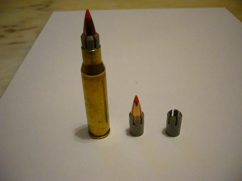 También monté puntas de .224" de varios pesos y tipos mediante sabots. No conseguí nunca una precisión decente y abandoné la idea. Ahora, con probar solo se pierde la verguenza y lo que te cobren por la caja.