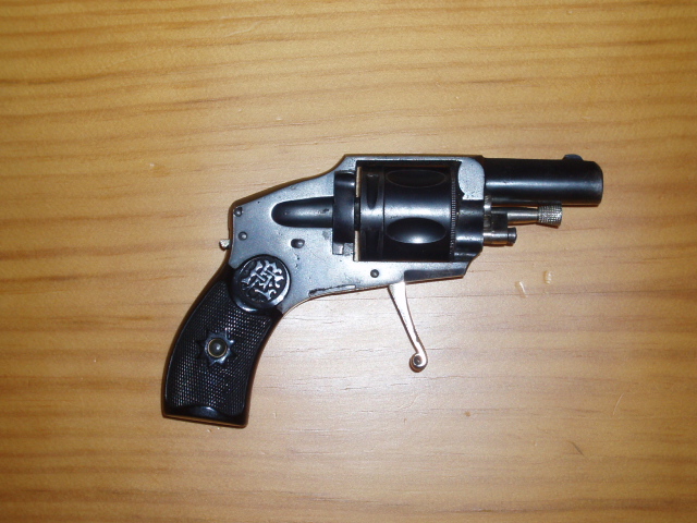 Hasta donde he llegado es que es un revolver velo-dog, de principios del s.XX, pero no he podido identificar el logo, parece una A y una E (¿armerias eibar?) no tengo ni idea, igual estoy diciendo una blasfemia, ruego que me perdoneis.