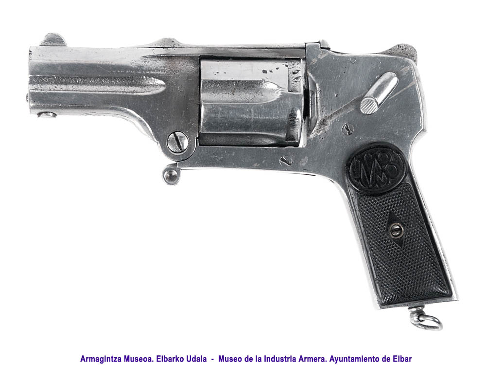 Estas piezas pertenecen al grupo de los denominados "Velo-Dog". El revólver "Velo-Dog" fue un arma ideada por el belga Mr. Charles François Galand en la década de 1890 como arma de defensa para que los ciclistas pudieran defenderse de los perros salvajes. Aunque en su concepción era un arma para un cartucho de 6mm. también podía cargarse con pimienta o bala de plomo para efectos más contundentes. Así rebasaron el objetivo al que estaban destinados y se convirtieron en armas de defensa personal . Posteriormente se produjeron variaciones preparados para cartuchos Browning de 6,35 mm. y 7,35mm, Nagant 7,62 mm. o Lebel de 8mm. En Eibar la fabricación de este tipo de armas fue iniciada por Francisco Arizmendi que en 1904 solicitó la patente de introducción, pero fueron muchos los armeros vascos que se interesaron por ellos, solicitando patentes por sistemas variadísimos: automáticos, de extracción automática,basculantes, oscilante, etc.
