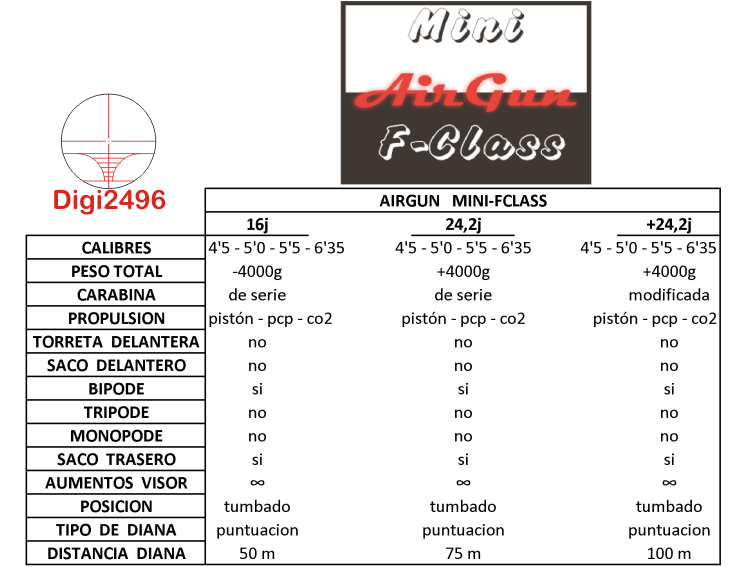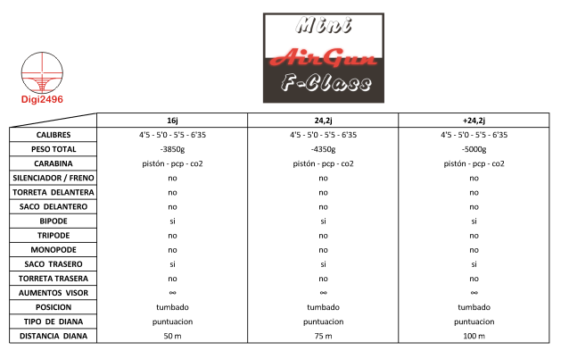 Podemos jugar con el tema del PESO y ser un poco más estrictos para las de 16j dejándolo en 3850g como máximo con todo ya montado y lista para disparar, como en el BR. Así, las que superen el peso tendrán que entrar en el grupo de las de 24.2j a 75m teniendo que hacer muy buenos disparos que realicen para así contrarrestar la menor potencia y velocidad del balín.