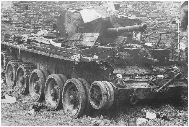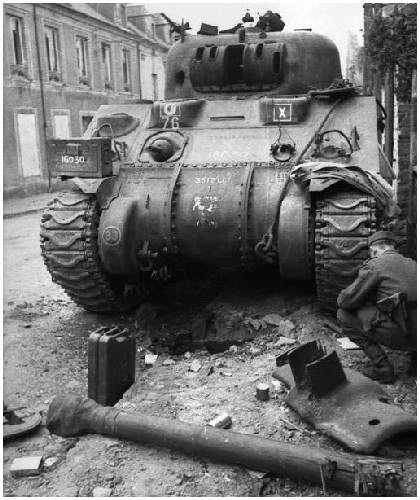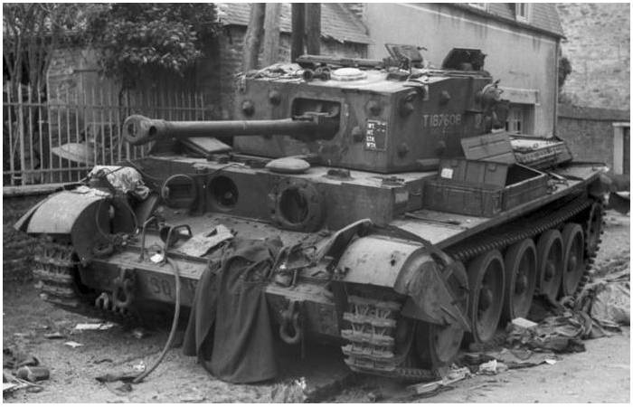 Carro de combate británico Cromwell durante la operación Charnwood. En Villers-Bocage/Francia, junio de 1944. En concreto mandado por el Capitán Paddy Victory. Según parece tuvo algún problema con las cadenas en el pavimento, por lo que el carro perdió tracción. El Capitán Paddy se encaramó en lo alto de su carro para ver que sucedía, a tiempo de ver el disipador de un carro Tiger asomando por la esquina, y…el resto de la historia ya veis cual fue…