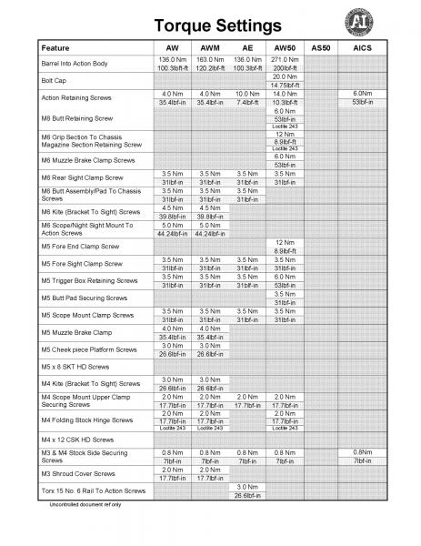 Torque Driver as used in Armourers Kit: UKAS calibration certificate included. Settings 1 - 6 newton Metres in .1 increments. Includes 6 x metric and 1 imperial hex driver, 2, 2.5, 3, 4, 5, 6mm and 3 1/16 inch which cover all cap head screws on Accuracy Rifles or AICS kit.