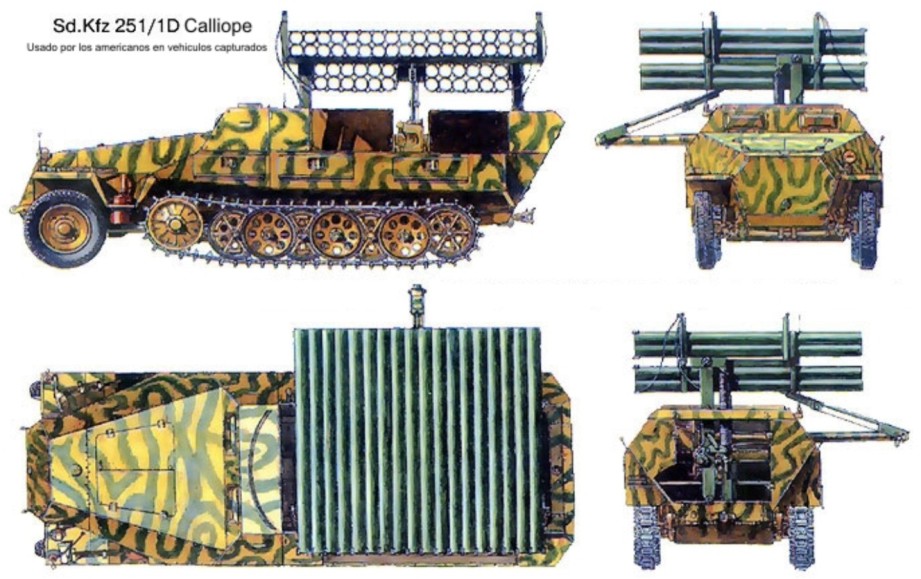 6.- Una curiosa version del Sd.Kfz 251-1 Ausf D capturado por los americanos durante los combates de Normandia y equipados con el sistema de lanzacohetes Calliope y que posteriormente fue recapturado por los alemanes.