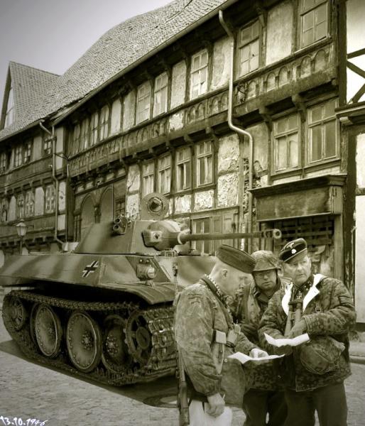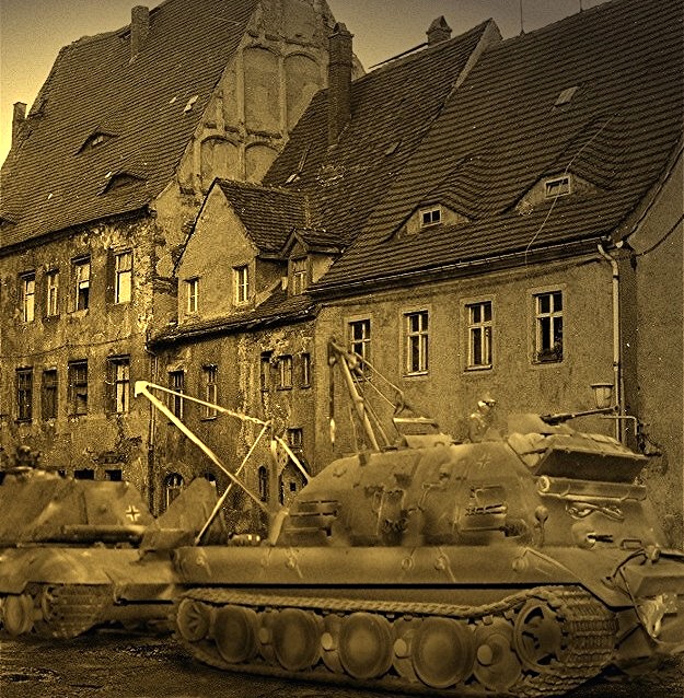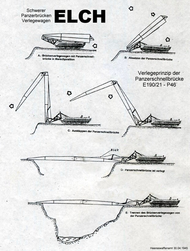 En Junio de 1945 la mayoría de los puentes en Alemania central están destruidos, por lo que los panzergruppen deben echar mano constantemente de los Schwerer Panzerbrucken Verlegewagen, carro lanzapuentes basado en el chasis del Tiger.