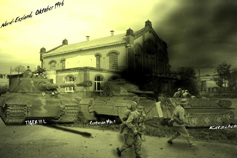 Ahí tienes un Centurión Mk 1 después de un enfrentamiento con un Tiger IIIL (Panzerkampfwagen E90 con cañón de 128mm). Al lado un adelanto de los APC y VCI desplegados a partir de 1946... :cow: