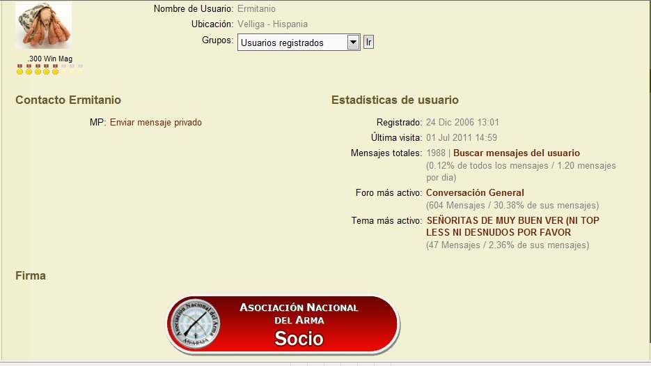 Ya para rematar he intentado poner una firma en mi perfil. De entrada no me permite insertar imágenes, al menos por el procedimiento establecido. Finalmente he logrado "engañar" al sistema poniendo un enlace de ImageShack, al hacerlo consigo que tanto en "Mi perfil" como al previsualizar mi firma APAREZCA la imagen pero al ver mis mensajes NUNCA APARECE.