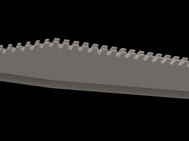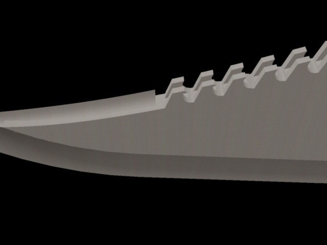 ,si le quitas la guarda esa que tienes atrás,creo que quedaría mejor y la delantera recta,¿el dentado?,si te lo tienes que hacer tiene un trabajo de cojones,porque hacer ese dentado doble,separados con un corte longitudinal¿que anchura tiene que tener la hoja?,piensa lo que hay que rebajar luego a base de radial,dejarlo uniforme hasta conseguir un filo,te digo todo esto pensando en hacerlo casero,que si tienes maquinaria adelante, original es desde luego.