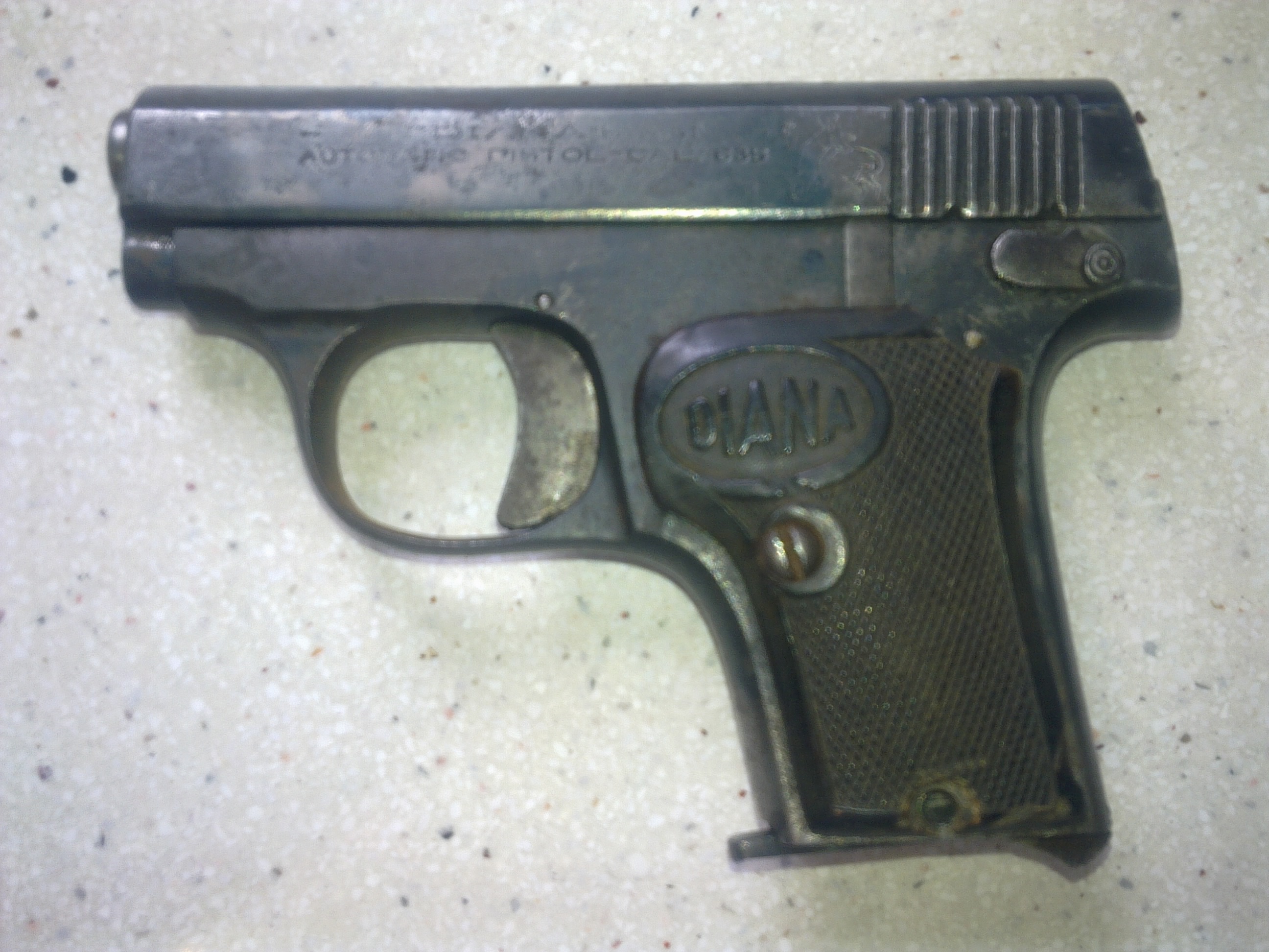 DIANA PATENT AUTOMATIC PISTOL CAL 6,35, y un hombre a caballo grabado.