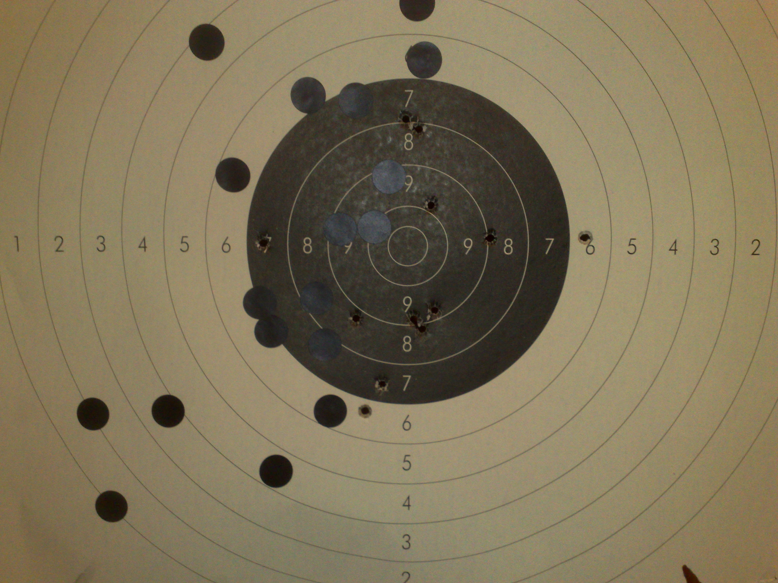 Respecto a la diana, tienes bastantes tiros en la zona baja-izquierda, y eso son gatillazos. Puede que el disparador vaya muy duro como comentas, y también puede ser por la falta de experiencia. Metes mucho dedo en el gatillo (lo ideal es disparar con la yema del dedo), o disparas demasiado brusco, lo que provoca un movimiento del arma hacia abajo. Pero todo eso se arregla con tiempo y entrenando.